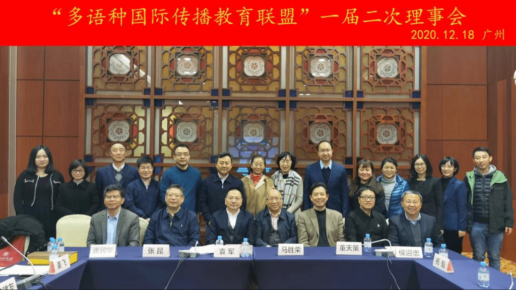020年12月18日,多语种国际传播教育联盟在广州白云国际会议中心召开一届二次理事会。北京外国语大学学术委员会主任袁军、新华社原副社长马胜荣、中央民族大学新闻与传播学院特聘院长张昆、北京外国语大学国际新闻与传播学院院长姜飞、广东外语外贸大学新闻传播学院院长侯迎忠等来自32家联盟发起单位的专家学者齐聚一堂,就国际传播人才的培养进行交流和探讨。