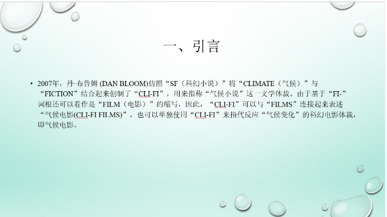 来自西北大学的仝广辉进行第二份报告的分享。其演讲的题目是“气候电影(Cli-Fi)——何是,何能、何为?”。他先从丹·布鲁姆提出的“CLI-FI”的概念出发,简要介绍了气候电影的体裁。然后从何是、何能、何为三个角度分别探讨了气候电影的分类、认识和内容体现。