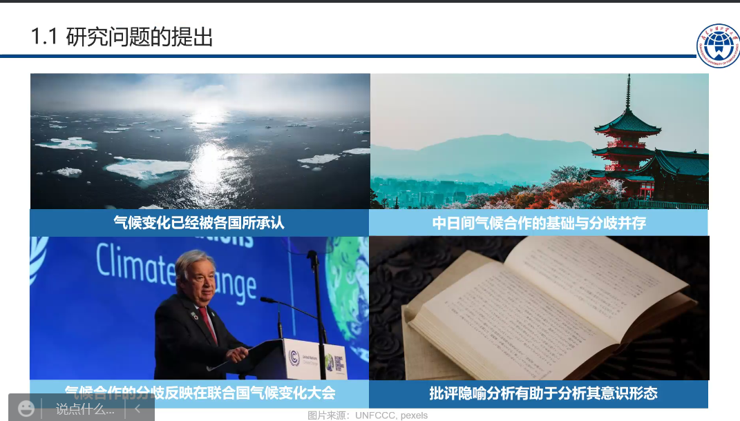 广东外语外贸大学秦志鹏同学分享的是《日本气候外交话语的隐喻与身份建构研究--联合国气候变化大会为例(2009-2021)》。他从中日两国间气候合作的基础和分歧出发,提到了在有关于气候方面的会议演讲中隐喻的重要性。接下来,他就隐喻的发展历史和近10年的气候外交话语进行了简单的介绍。以日报发言人2009年至2021年联合国气候变化大会上的公开发言为研究对象,考察了日本在这些发言中存在的隐喻和相关的隐喻映射模式。