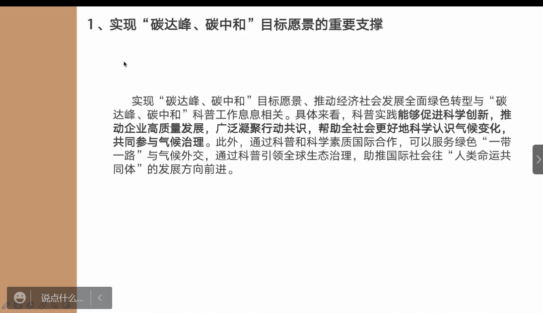 她指出“碳达峰,碳中和”这两个议题本身就具有很强的政治性,无论是国家间还是各种世界组织中,都具有很高的讨论度。这种气候变化甚至有可能会成为部分国家阻碍他国发展的政治工具。但是从另一个方面来说,由于气候变化是微小的,“碳达峰,碳中和”相较于其他事务缺乏显著性,难以获取公众注意力。而“碳达峰,碳中和”的科普主体局限在国家政府层面,难以深入到公众主体,传播效果有所局限。在演讲的最后,张虹霞同学从政治站位、体制机制、国际传播三个层面提出了自己对于“碳达峰,碳中和”科普实践的一些优化措施。