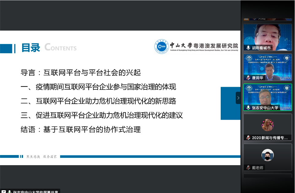 中山大学传播与设计学院博士生导师、国家高端智库粤港澳发展研究副院长张志安教授围绕《平台社会语境下城市危机治理的现代化》展开演讲,讲演主题以抗击新冠肺炎疫情为背景,分别围绕介绍互联网平台和平台社会的兴起、疫情期间互联网平台企业参与国家治理的体现、互联网平台企业助力危机治理过程中呈现的新思路以及如何在未来继续发挥其作用提出了建议。最后,张教授探讨了未来基于互联网平台协作式治理中可能存在的问题和未来发展方向,并指出探索基于互联网平台的协作式治理机制将会是未来完善国家治理体系的重要路径。