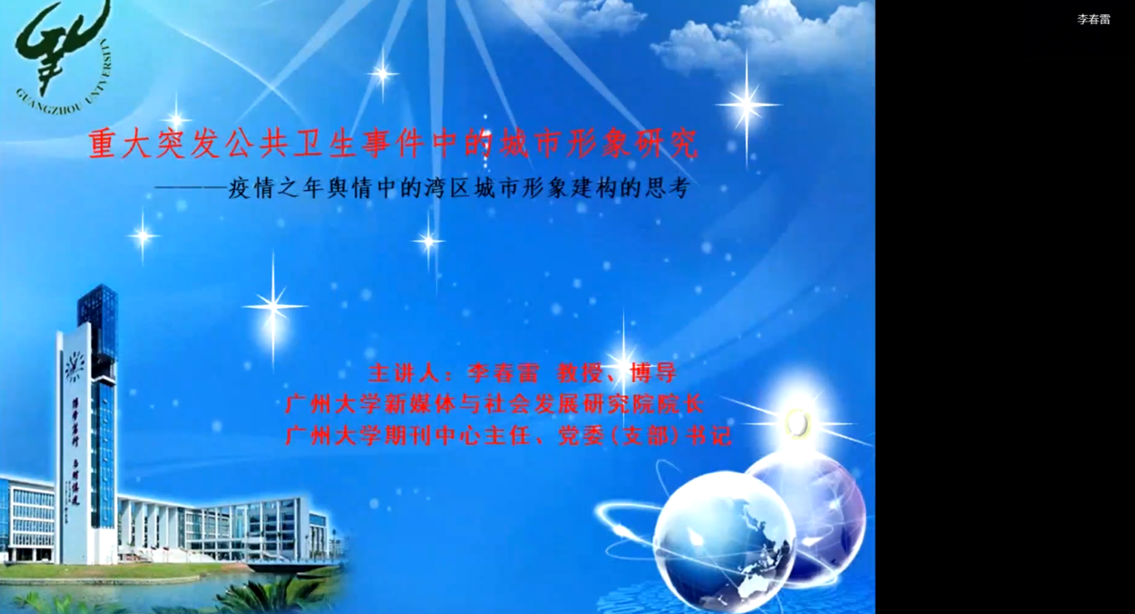广州大学新媒体与社会发展研究院院长、广州大学期刊中心主任、博士生导师李春雷教授围绕《重大突发公共卫生事件中的城市形象研究——疫情之年舆情中的湾区城市形象建构的思考》展开演讲。演讲分为三个部分,第一部分从疫情之年舆情的情绪传播逻辑入手,深入分析当前现代性的结构型舆情,引出关于疫情之年的思考,并指出“凝聚式”的舆情情绪是由利益相关性到情绪关联性的转变。第二部分剖析疫情舆情中城市形象的认知特质,认为其具有高风险性、高浸入性、高聚合性、高场景化、高冲突性等特点。最后提出疫情中湾区城市形象建构的进路,城市形象认知建构中需要“去道德化”的取向,需要进行问题式治理的转换,规避形象构建中的隐形风险。