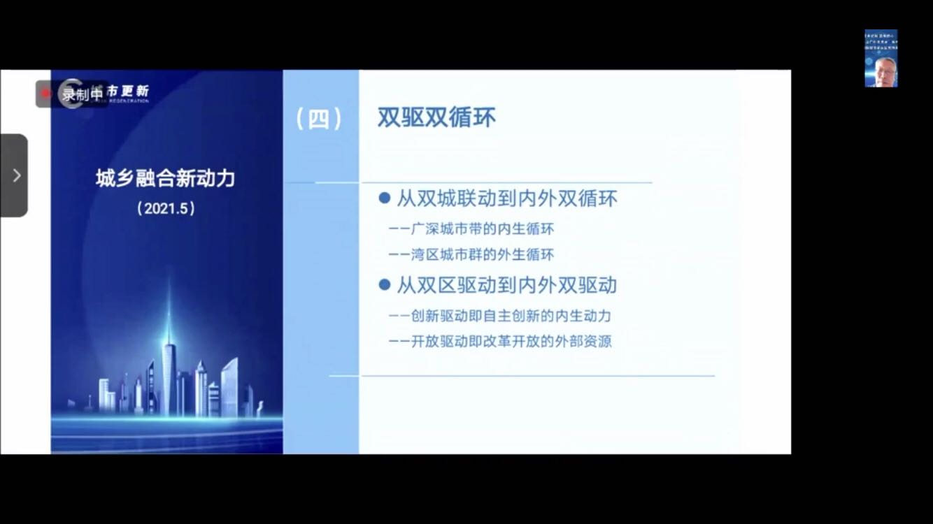 暨南大学传播与国家治理研究院城市治理与传播研究中心主任曹轲教授围绕《城乡融合新动力》展开演讲。曹教授首先将城乡融合新动力概括成三个“五”,分别是五大空间再造、五大融合走向、五大集成创新。他指出不论是广深城市带的“双城联动”,还是湾区示范区的“双区驱动”,都应当利用真正的创新驱动和开放驱动加入到内外的大循环中,真正做到“从双区驱动到内外双驱动”和“从双城联动到内外双循环”,让广深城市带的形象在全球真正变成湾区一流的、领先的、品质更高的、更有活力的城市。