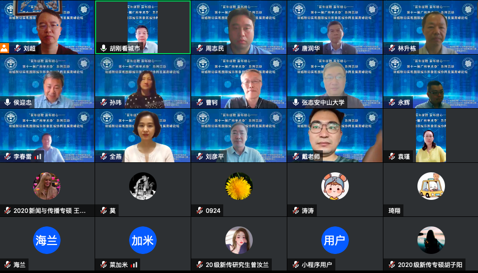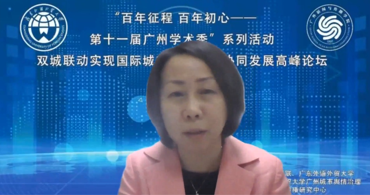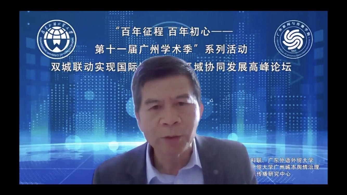 5月28日,由广州市社科联,广东外语外贸大学主办,广州市人文社科研究重点基地广东外语外贸大学广州城市舆情治理与国际形象传播研究中心承办的“百年征程、百年初心——第十一届广州学术季”系列活动之一“双城联动实现国际城市形象区域协调发展高峰论坛”通过腾讯会议线上举行。