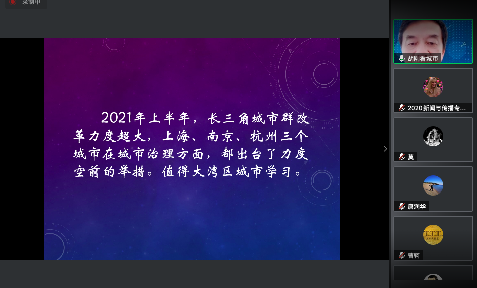 第四位演讲嘉宾是暨南大学公共管理学院教授、华南城市研究会会长胡刚。胡刚教授围绕《城市治理与改革创新:2021的多城市考察》展开演讲,重点介绍了上海、南京、杭州三个城市近年的变化,他指出这三个城市在城市治理方面,出台了力度空前的举措,值得大湾区城市学习。