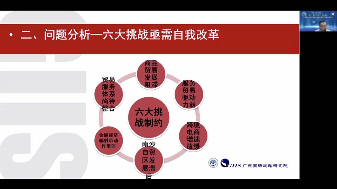 最后一位发言的嘉宾是广东外语外贸大学国际战略研究院博士生导师、珠江学者韩永辉教授。韩永辉教授围绕《广州建设粤港澳大湾区国际商贸中心的思路与对策——基于国际商贸中心城市竞争力视角》展开演讲,他首先利用六大维度剖析广州当下所处的环境现状。随后,他指出当下需要面对的六大挑战,包括商品贸易发展阻滞、服务贸易驱动力弱、跨境电商增速放缓、南沙自贸区发展滞后、会展经济辐射带动作用弱、贸易服务体系尚待整合,这亟需自我改革和自我创新。最后,韩教授针对粤港澳大湾区国际商贸中心的发展现状、问题及不足,提出了相应的路径分析和对策建议。